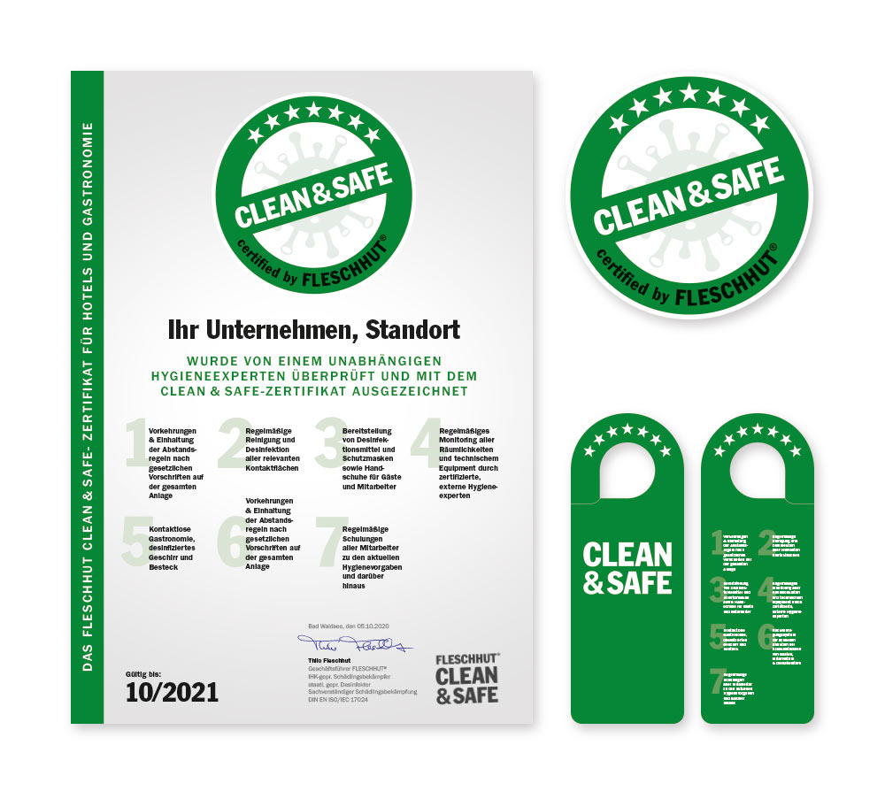Als Beherbergungsbetrieb und/oder Gastronom sind Sie durch die aktuelle COVID-19 Situation mehr als gefordert. Mit der Fleschhut CLEAN & SAFE-Zertifizierung dokumentieren Sie gegenüber Ihren Gästen geprüfte Hygienestandards auf Basis aktueller COVID-19-Maßnahmen. Laut aktueller Umfragen von Bewertungs- und Buchungsportalen, legen über 80% aller Hotelgäste & Restaurantbesucher Wert auf umfassende Hygienestandards. Lassen auch Sie sich unkompliziert prüfen und zertifizieren.