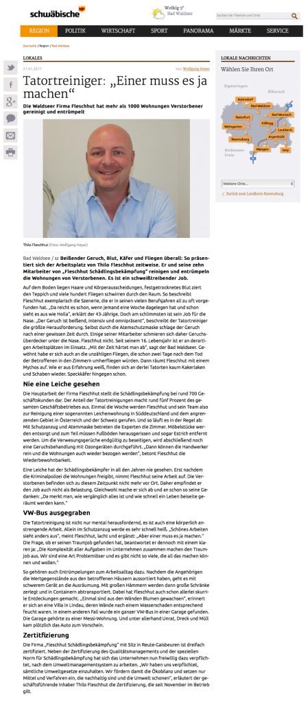 Unter dieser Überschrift veröffentlicht die Schwäbische-Zeitung auf schwäbische.de einen spannenden Beitrag zum Thema Tatortreinigung.